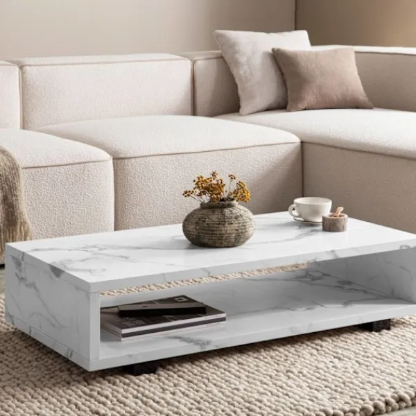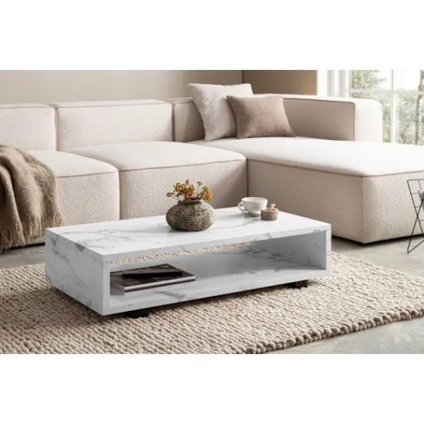 Detta enkla soffbord har en stor matt marmor-look topp och ett öppet förvaringsfack för extra utrymme. Perfekt för att lagra olika föremål med ett barriärfritt toppideal för fjärrkontroller, tidskrifter och mer.