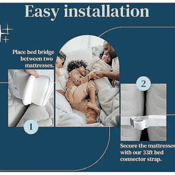 ENKEL INSTALLATION – När du behöver göra en större säng, lägg bara dina två madrasser sida vid sida. Placera sängbryggan mellan de två sängarna för att stänga gapet. Säkra sängarna tillsammans med hjälp av anslutningsremmen och voila