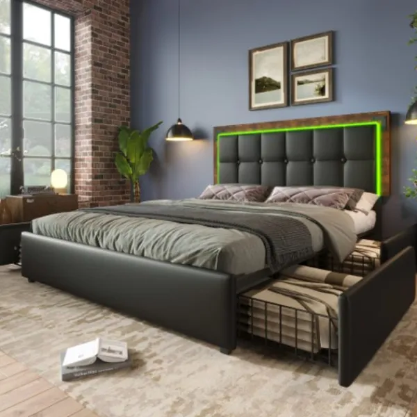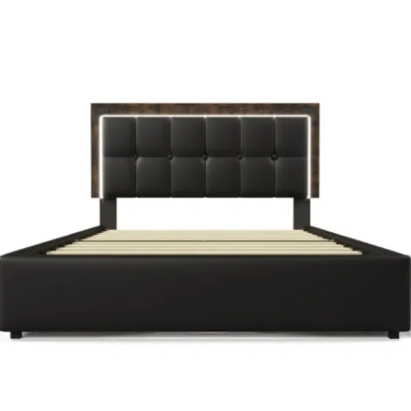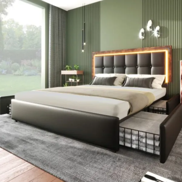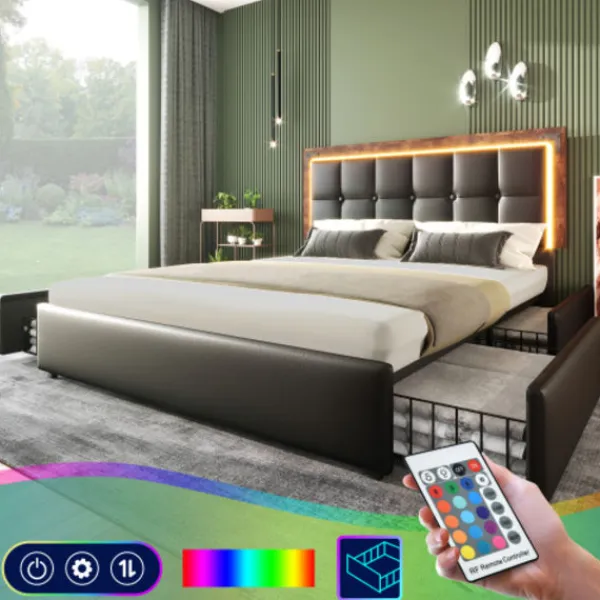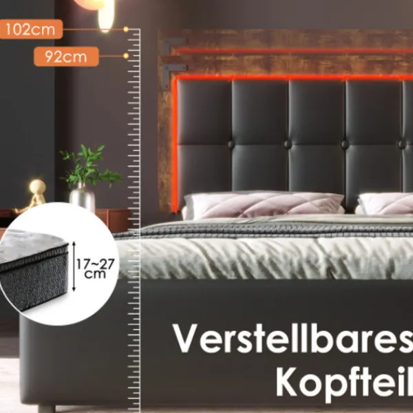 LED-belysning Elegant design: Medan huvudgavelns överdrag är vackert uppdelat av en elegant tejpning, är slitbanan och huvudgaveln täckta med ett högkvalitativt lyxigt ekoläder, som finns i tre storlekar. LED-belysningen ger en modern stil till ditt sovrum, med fjärrkontroll kan du byta färger och ljusstyrka till bekväma solstolar.