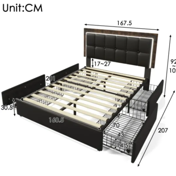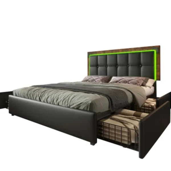 Förvaringsdesign: Sängen är utrustad med 4 lådor med stor kapacitet. Två sidor av sängen är utrustade med lådor som gör att du kan fästa lådan ordentligt i sängen om lådan inte används för att rengöra ditt sovrum. Förvaringslådorna kan enkelt rullas ut och rullas in tack vare rullarna på marken. Du kan också ta bort lådan och förvara stora föremål under sängen.