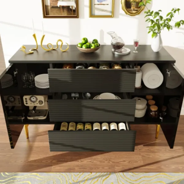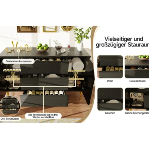 Multifunktionellt förvaringsutrymme: Den har en design med tre fack med avsevärt låddjup och bredd, där en stor mängd vin och andra föremål kan förvaras för att möta förvaringsbehoven för föremål i scenarier som familjefester. Det erbjuder också plats för en stor mängd porslin, köksredskap etc. Förutom lådor finns det flera fack inuti skåpet, som kan justeras i tre steg.