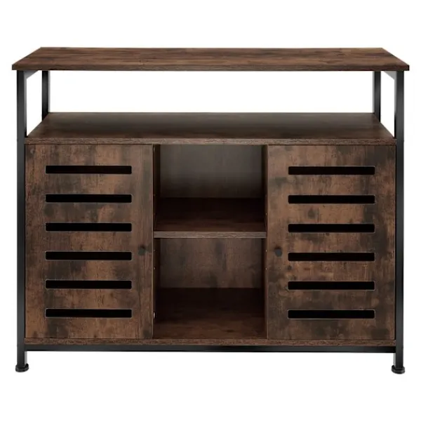 Om du uppskattar attraktiva kontraster och en tydlig design är det mångsidiga Warrington-sidobordet från tectake ett måste för ditt hem. Den svarta stålramen, den naturtrogna träimitationen och de moderna linjerna skapar en imponerande estetik med en iögonfallande industriell stil. Skåpet har 2 hyllor, 2 skåpsfack och en öppen mittsektion som erbjuder både en rymlig presentationsyta och gott om förvaringsutrymme. Den höga funktionaliteten är typisk för denna puristiska möbelstil, med lättstängda magnetdörrar, justerbara hyllplan och exakta justerbara skruvfötter.