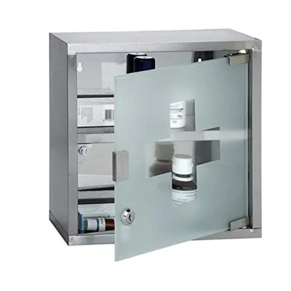 Det väggmonterade medicinskåpet är utrustat med ett lås som skyddar dina mediciner från obehörig åtkomst. De två hyllplanen i rostfritt stål erbjuder tillräckligt med utrymme för att organisera och hålla ordning på olika mediciner och vårdprodukter. Det frostade glaset ger en diskret och stilren känsla samtidigt som det skyddar innehållet från insyn.