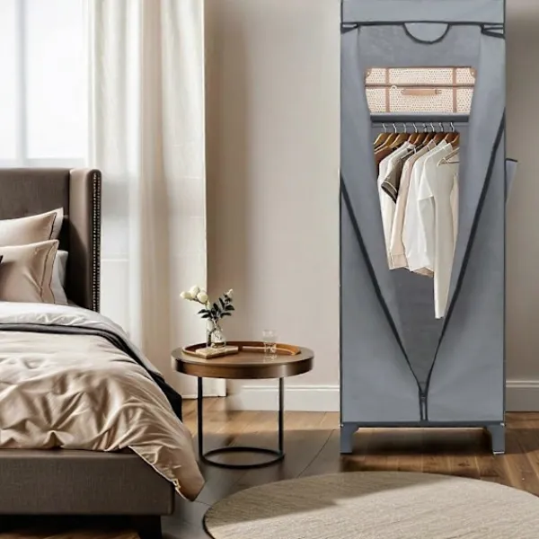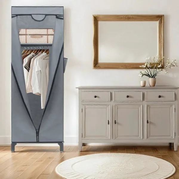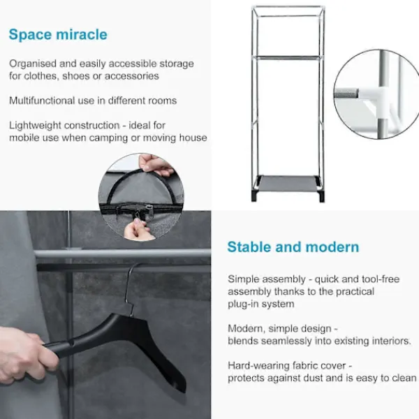 Detta fashionabla DIY plug-in hyllsystem består av ett stort fack (förvaringsutrymme, 2 klädstänger, sidofickor och helt användbar botten). Tack vare sin moderna och tidlösa design anpassar sig skåpet perfekt till alla rum och interiörer och tar samtidigt upp lite plats. Dra nytta av denna genomtänkta och mångsidiga design, eftersom dina tillhörigheter alltid är prydligt undanstoppade och inom räckhåll!