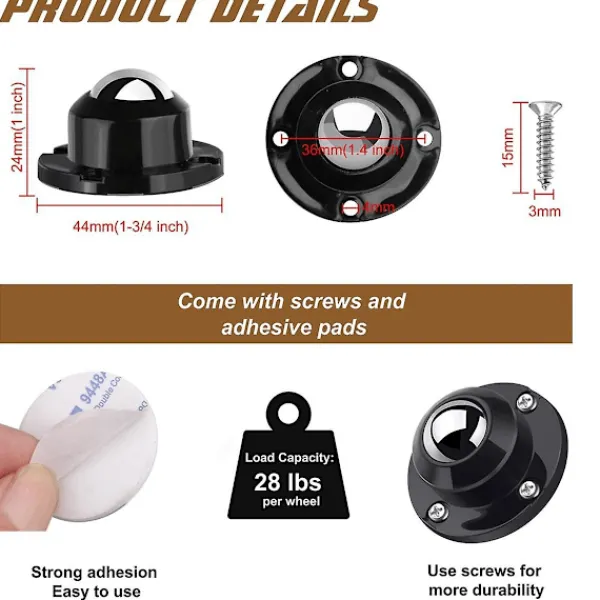 [Lastkapacitet]: 28 lbs per hjul. Totalt 110 lbs för 4 hjul. Hjulstorlek: Total höjd 24 mm (1 tum), monteringsplatta diameter 44 mm (1-3/4 tum), monteringshål diameter 4 mm, avstånd mellan diagonala hål 36 mm.[Låg profil och 360 graders rotation]: Lågprofilshjul lägger inte till för mycket höjd på möbler och kan ändå bära en hel del vikt. Större stålkulor i ABS-fäste rullar smidigare jämfört med andra små kulor.[Snabb och enkel installation] Installera svängbara hjul på fötterna/benen på t.ex. soffbord, hyllor, skåp, byråer, växtstativ med medföljande självhäftande dynor eller skruvar. Gör det enkelt och smidigt att flytta möbler. Tips: 1. Dessa hjulrullar fungerar endast på släta och hårda ytor, kan lämna spår på träytor. 2. Vi föreslår att du använder skruvar för att installera hjul för tunga föremål.[Bred tillämpning]: Inte bara för möbler utan även för förvaringslådor, arkivskåp, nattduksbord, förvaringslådor under sängen, verktygslådor, luftrenare, stående/tornfläktar och andra apparater…