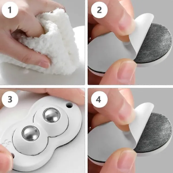 Lätt att installera Mini-möbelhjulet är lätt att installera utan verktyg, enkelt och bekvämt att installera. Dra bara av klistermärkena för att installera och tryck sedan ordentligt på den släta ytan. Det rekommenderas att vänta 24 timmar och effekten blir bättre vid användning.