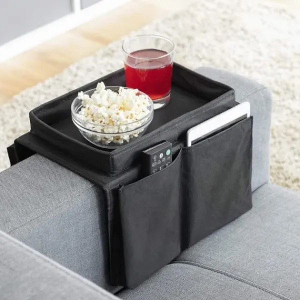 Praktiskt armstödsfack som passar de flesta soffor. Brickan gör att du kan ha dina favoritdrycker och snacks i närheten, utan att du behöver hålla dem själv eller nå dem på soffbordet. Facket har ett litet bord på toppen och 6 sidofickor, så att du också kan förvara din telefon, fjärrkontroll etc.