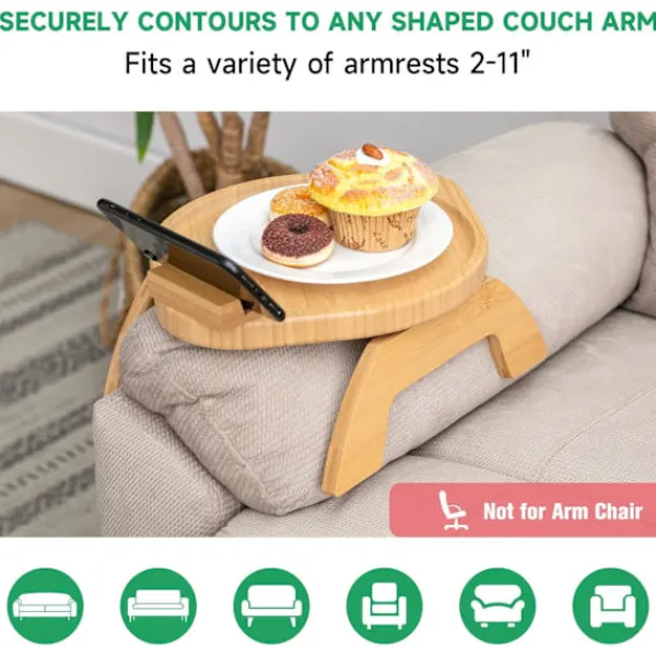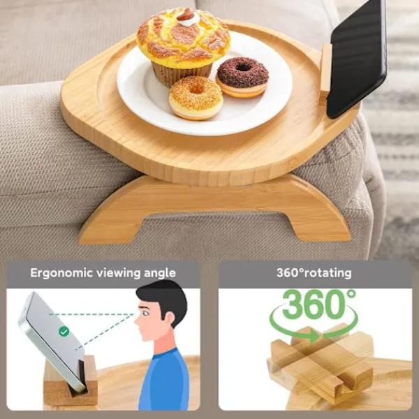 Speciell telefonhållare: vår soffaarmstödsbricka är utrustad med ett 360° roterande fäste som låter dig titta på videor på mobiltelefoner och surfplattor från valfri vinkel, vilket ökar användbarheten av denna soffaarmstödsbricka