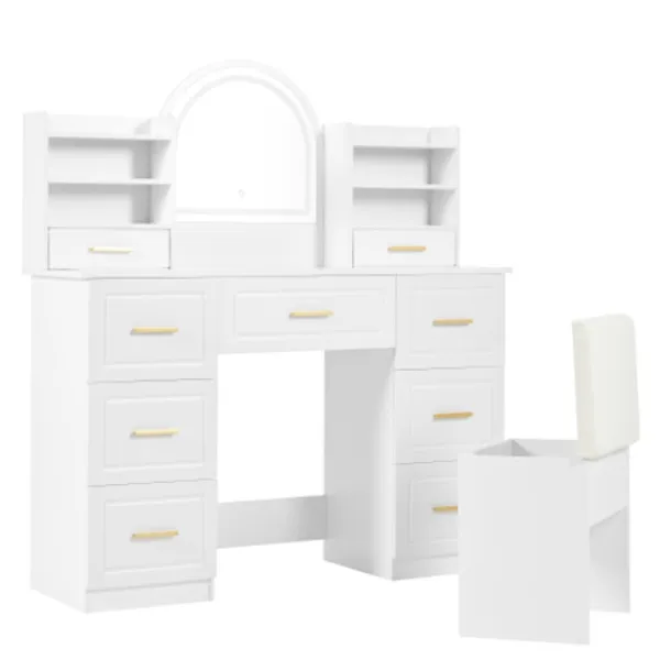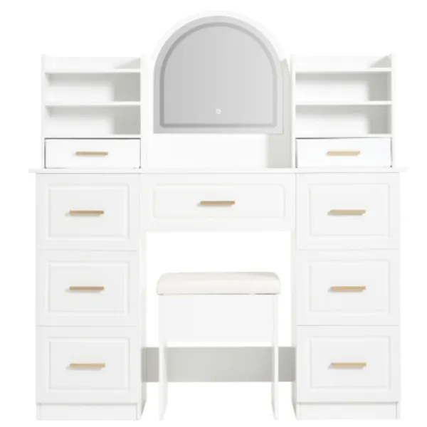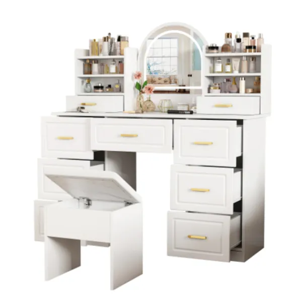 Intelligent LED-sminkbelysning: Sminkbordet har en stor spegel med integrerad LED-belysning i tre färger: kallvitt, naturligt vitt och varmvitt. Denna belysning anpassar sig till olika sminksituationer. Genom att trycka och hålla ned pekknappen kan du enkelt justera ljusstyrkan på belysningen för att skapa den idealiska ljusmiljön för perfekt sminkapplicering.