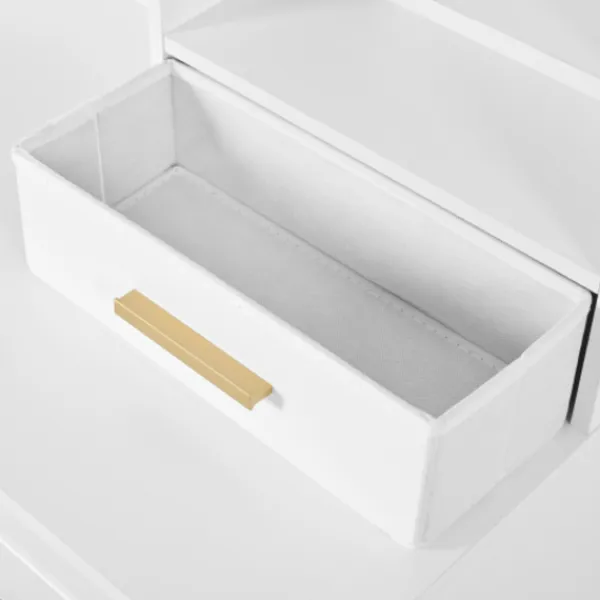 Gott om förvaringsutrymme: Sminkbordet har flera lådor som erbjuder gott om förvaringsutrymme för att snyggt förvara kosmetika, hudvårdsprodukter, smycken och accessoarer. Den nedfällbara lådan på bordsskivan är bekvämt utformad och kan öppnas eller fällas undan efter behov för att spara utrymme. Tack vare de generösa förvaringsmöjligheterna kommer din arbetsyta alltid att vara städad och organiserad – inget mer stök.