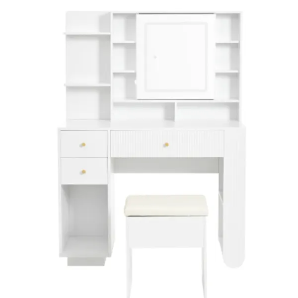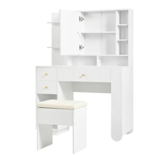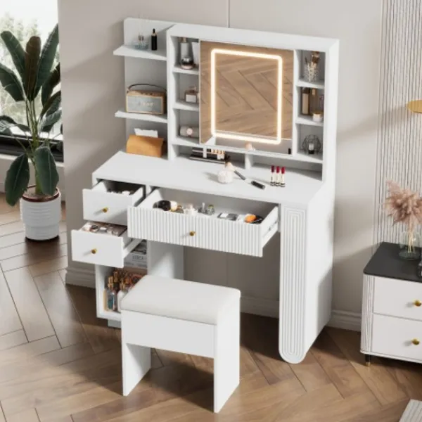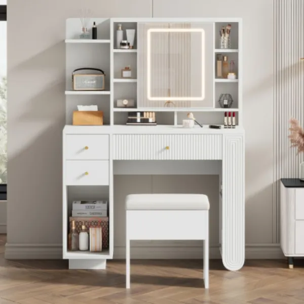 Mångsidigt förvaringsutrymme: Utrustad med öppna fack, flera lådor och sidodolda förvaringsutrymmen för att flexibelt möta olika behov. De öppna facken på bordsskivan är perfekta för ofta använda kosmetika, de stora lådorna erbjuder plats för smycken eller viktiga föremål, och sidohyllan kan användas för ansiktsmasker eller locktänger. Detta håller ditt skrivbord snyggt och organiserat.