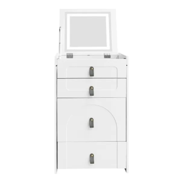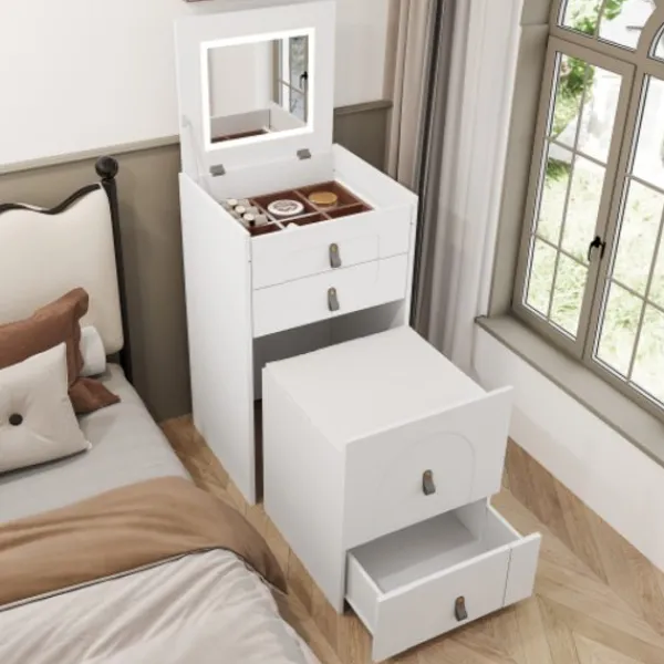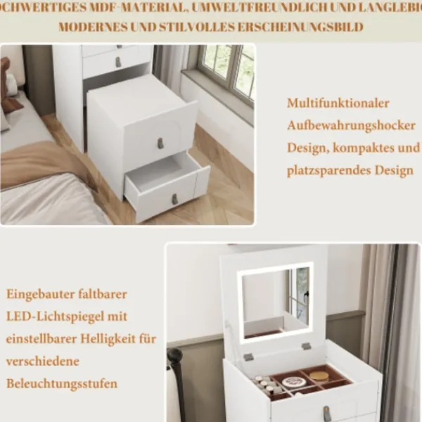 Perfekt förvaringspall: Utrustad med en förvaringspall som passar perfekt till sminkbordet, den erbjuder inte bara en bekväm sittupplevelse, utan kan också fällas ihop på ett platsbesparande sätt. Denna sofistikerade pall kan enkelt placeras under bordet utan att ta upp extra utrymme, vilket rengör och sorterar din garderob.