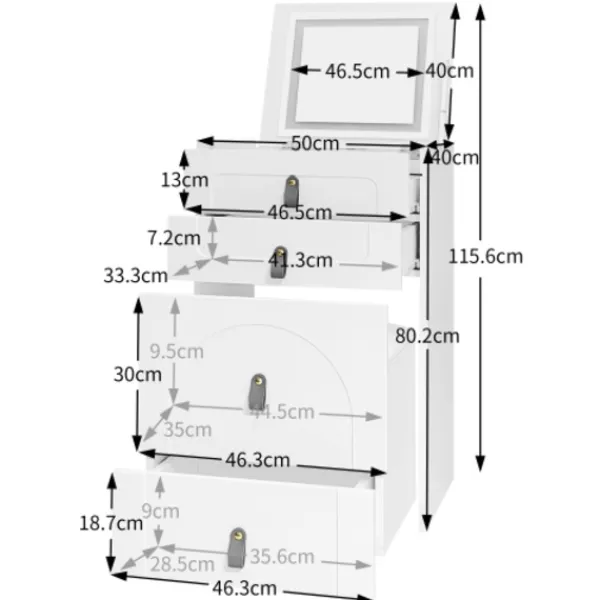 Stora rymdbaserade förvaringsutrymmen: Vår sminkdesign betonar den effektiva användningen av varje tum av utrymmet. Utrustad med noggrant utformade förvaringsutrymmen och fack kan föremål enkelt nås och förvaras genom rimlig fördelning. Vanligt använda kosmetika kan enkelt tas fram medan sällan använda föremål förvaras ordentligt, vilket förbättrar din användningseffektivitet