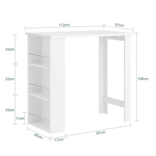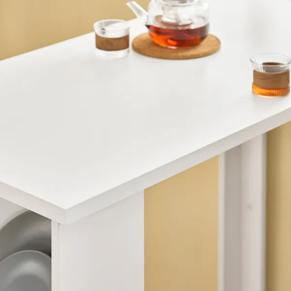 Denna kompakta köksö erbjuder en smart och rymdskapande lösning för moderna hem. Med sitt integrerade designkoncept kombinerar den ett praktiskt köksbord med praktiska sidohyllor, vilket gör den idealisk för lägenheter, kök, vardagsrum och hemmakontor. Den fungerar utmärkt som både kökshalvö och barbord, särskilt i mindre utrymmen där varje centimeter räknas. Bordets tredelade förvaringshyllor ger gott om plats för tallrikar, glas och köksredskap, vilket håller allt organiserat och lättillgängligt. Oavsett om du använder det som frukostbord, serveringsyta eller för små sammankomster, skapar det en elegant och funktionell miljö. Ytterligare flexibilitet ges genom den tvåsidiga monteringen, som kan justeras till vänster eller höger efter behov. Med tydliga och enkla monteringsanvisningar sätts bordet snabbt upp, redo att tjäna som bistrobord, köksbord eller smalt konsolbord – en snygg och praktisk möbel som passar i alla hemmiljöer.