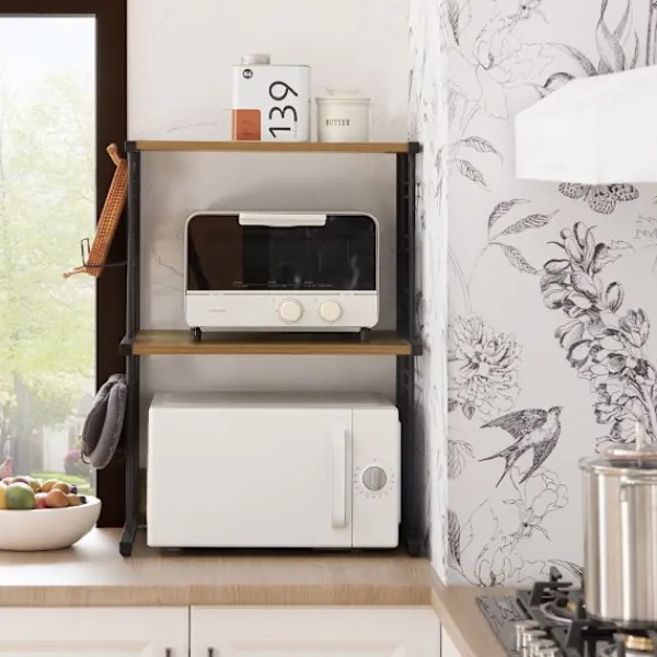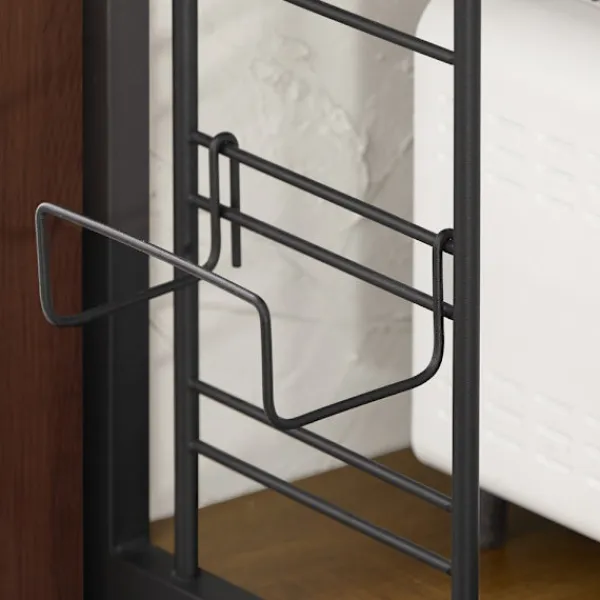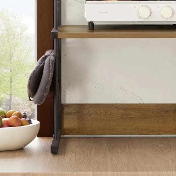 Med sitt vackra kombinerade utseende av träimiterad MDF och svart metall ger denna hylla en charmfull retrokaraktär som smälter in i både lantliga och moderna hem. Den robusta konstruktionen med E1-certifierade material säkerställer lång livslängd och enkel underhåll. Hyllvagnens intelligenta design gör den till det perfekta komplementet i köket – vare sig du behöver extra arbetsyta, smart förvaring eller en dekorativ möbel.