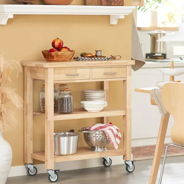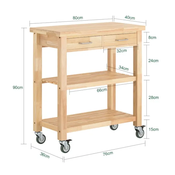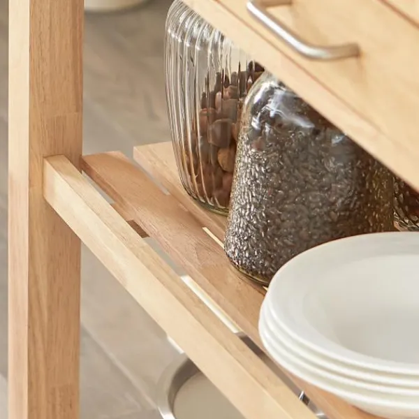 Vagnen med sin eleganta design är extremt mångsidig och gör ett fantastiskt uttalande i alla rum. Om ditt problem är brist på utrymme är denna enkla och eleganta möbel precis rätt val. Med sitt stora inre utrymme erbjuder den kapacitet att lagra tallrikar, dukar och andra köksredskap. Trots sina små dimensioner hittar den lätt sin plats. Vagnen har en praktisk låda och två hyllor, perfekt för förvaring av dina kökstillbehör.