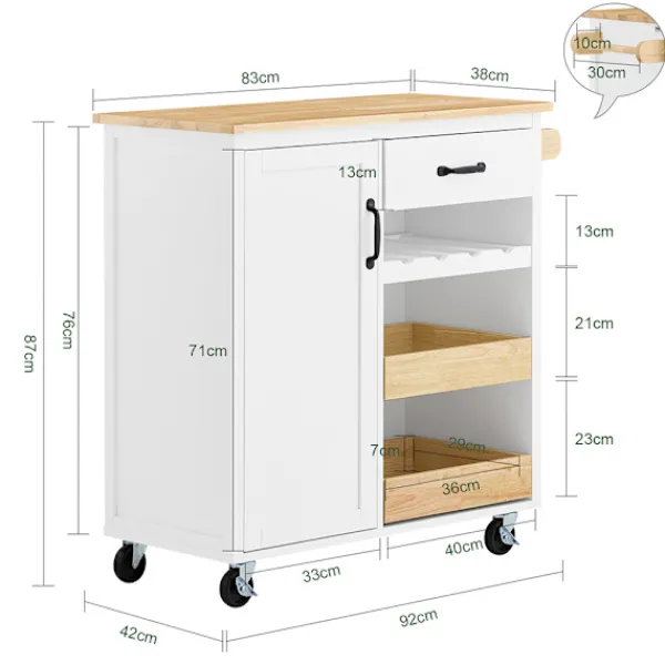 Denna rymliga köksvagn (92x42x87 cm) erbjuder generös plats för köksartiklar, disk och redskap. Dess kompakta design är idealisk som platsbesparande lösning i kök eller matsal. De avtagbara trågen ger ytterligare mångsidighet för förvaring av frukt eller koppar. Med tydliga monteringsinstruktioner sätts vagnen snabbt ihop för omedelbar användning.
