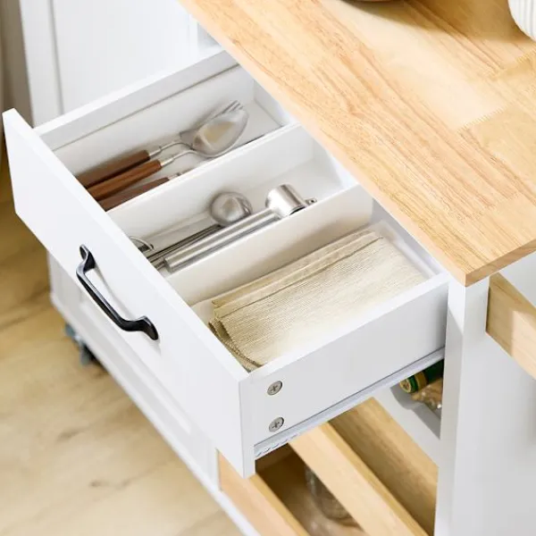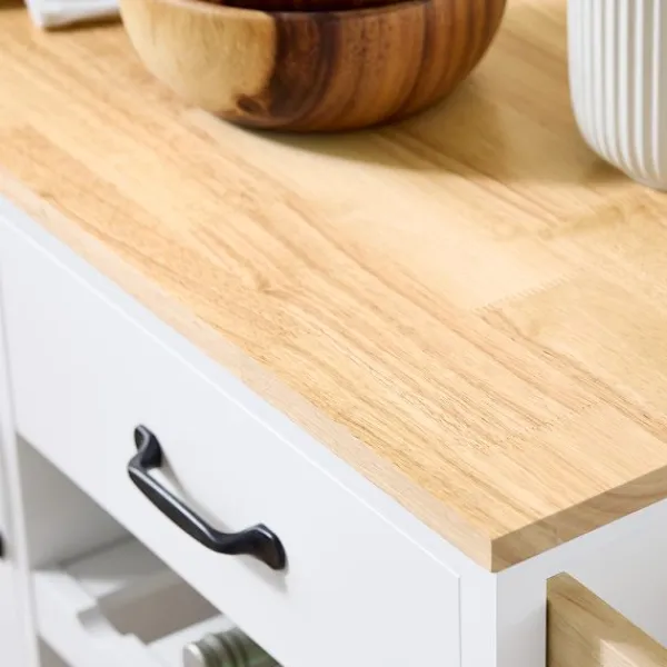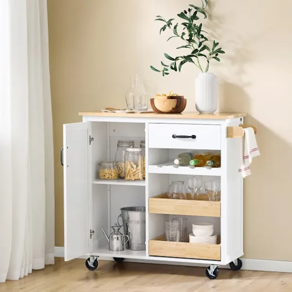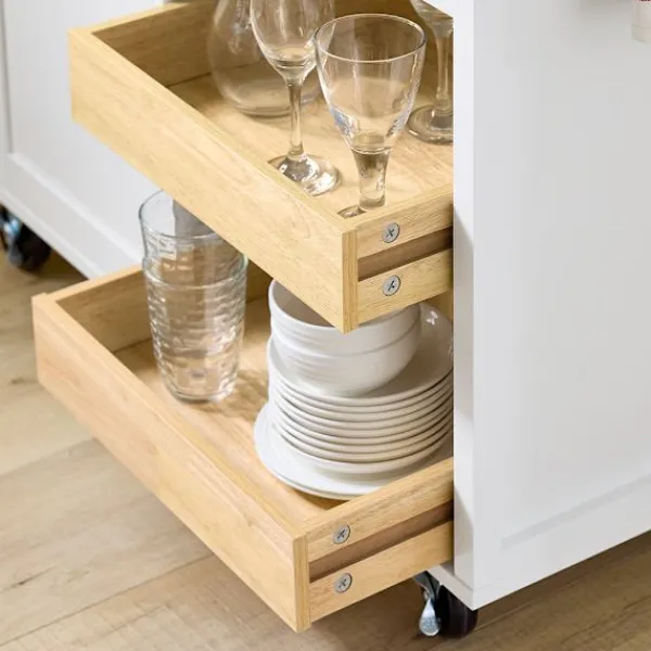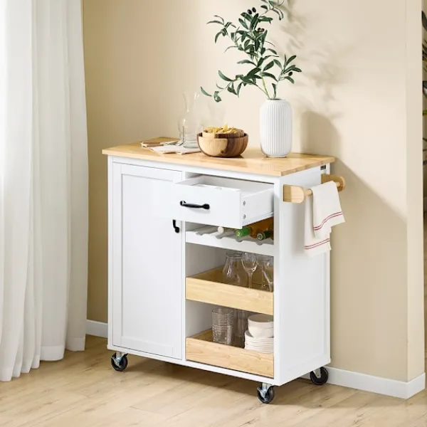 Denna robusta köksvagn kombinerar smart förvaring med utmärkt rörlighet. Perfekt för moderna hem som behöver extra yta och funktionalitet.