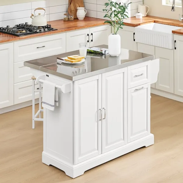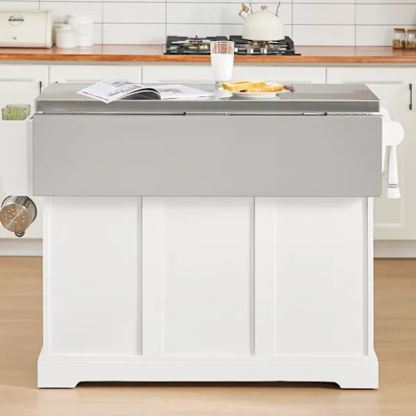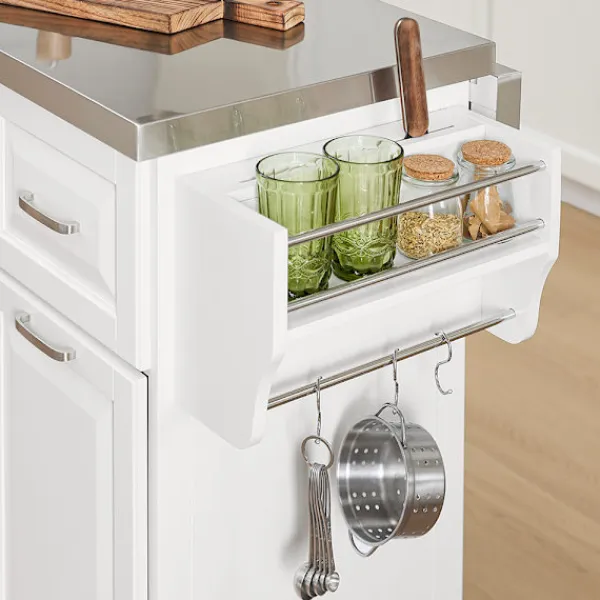 Denna moderna köksö erbjuder ett brett och välordnat förvaringsutrymme, perfekt för att organisera köksredskap och förbrukningsvaror. Den kompakta men utbyggbara designen gör den idealisk för mindre kök eller som platsbesparande extra arbetsyta. Med sina utdragbara lådor och generösa lastkapacitet fungerar den utmärkt både som stationär enhet och rörlig köksvagn.