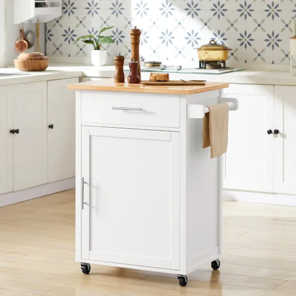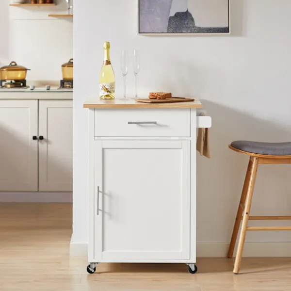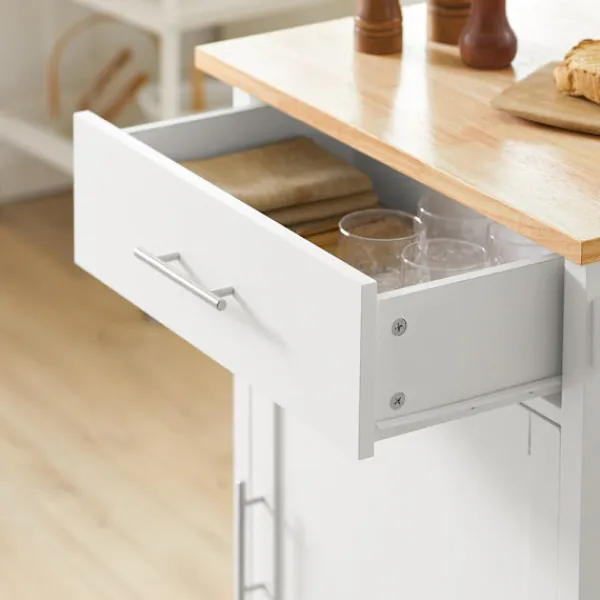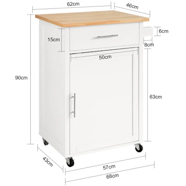 Denna praktiska köksvagn erbjuder optimal förvaring för köksredskap och hemaccessoarer med sin kombination av stängd låda och öppet skåp. Den eleganta naturvita ytan passar in i de flesta inredningsstilar, medan de smidiga länkhjulen gör den lätt att flytta mellan rum. Ytan är tålig och enkel att rengöra, idealisk för dagligt bruk i aktiva hem.