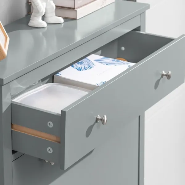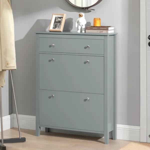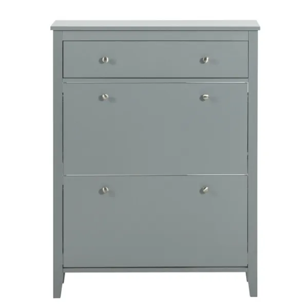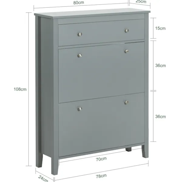 Denna moderna skohylla erbjuder en smart och stilren lösning för skoförvaring. Dess kompakta design med reducerat djup gör den idealisk för trånga utrymmen som långa korridorer. Med sina två dörrar håller du enkelt dina skor organiserade och snabbt tillgängliga. Den snygga grå ytan ger ett elegant inslag i vilket hem som helst. Hyllan är utformad för att spara plats och har nedfällbara fack för optimal användning av utrymmet. För säkerhets skull monteras den på väggen med medföljande tippskydd.