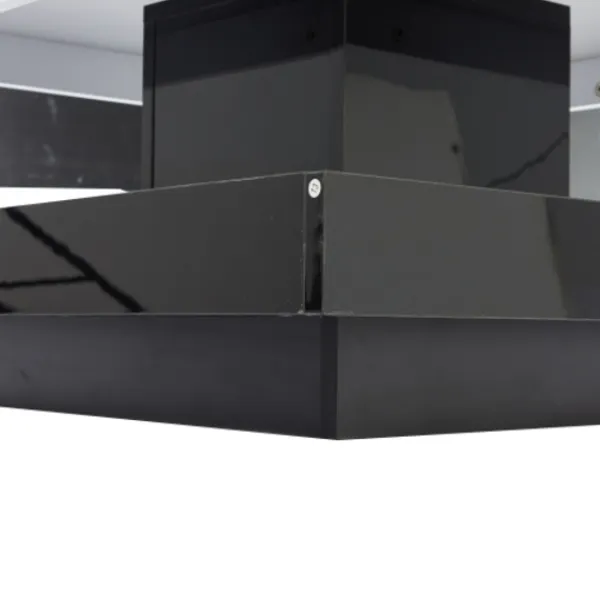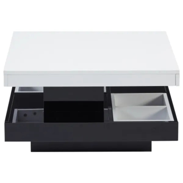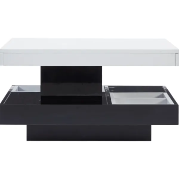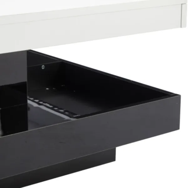 Hela soffbordet är konstruerat av spånskiva med en vit topp och svart bas.