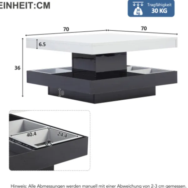 Produktens mått är 70 x 70 x 36 cm, och soffbordet har en lastkapacitet på 30 kg.