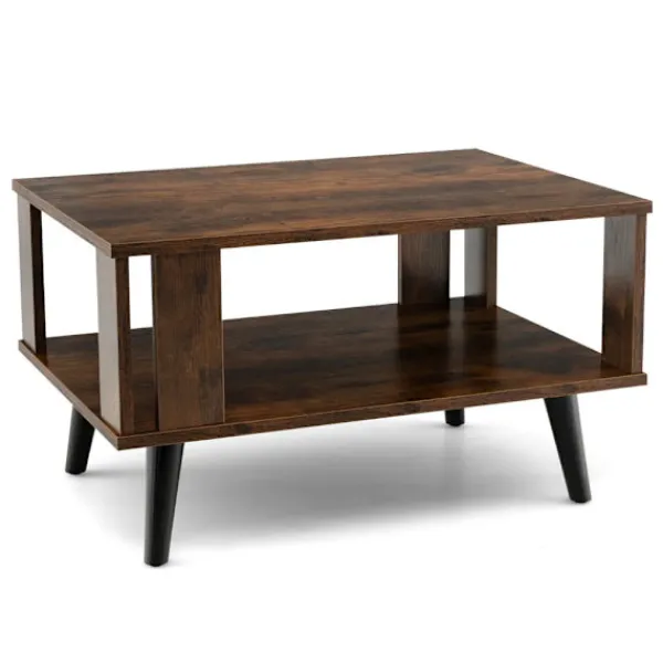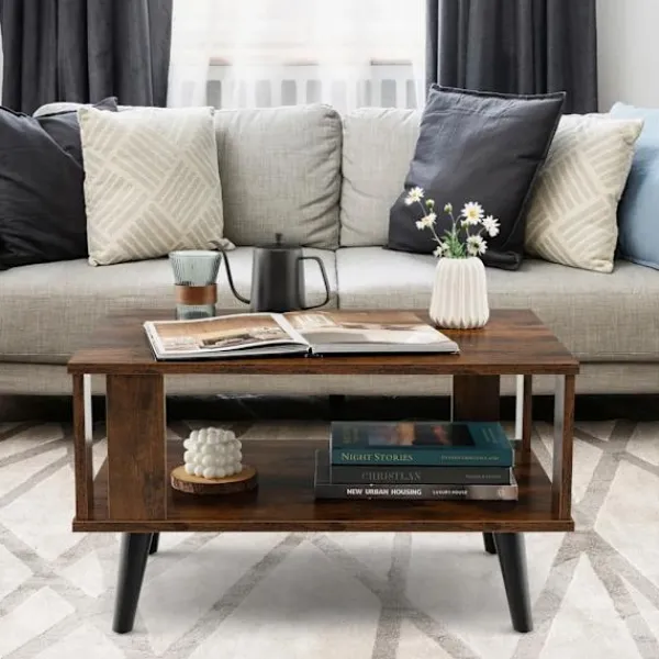 Detta soffbord kombinerar rustik charm med modern industridesign. Den generösa bordsskivan rymmer kaffekoppar, snacks, laptop eller fjärrkontroll, medan den öppna hyllan under ger plats för böcker, tidningar och förvaringslådor. Sidopaneler förhindrar att föremål glider ner, och de höga benen gör det enkelt för robotdammsugaren att komma åt under bordet.