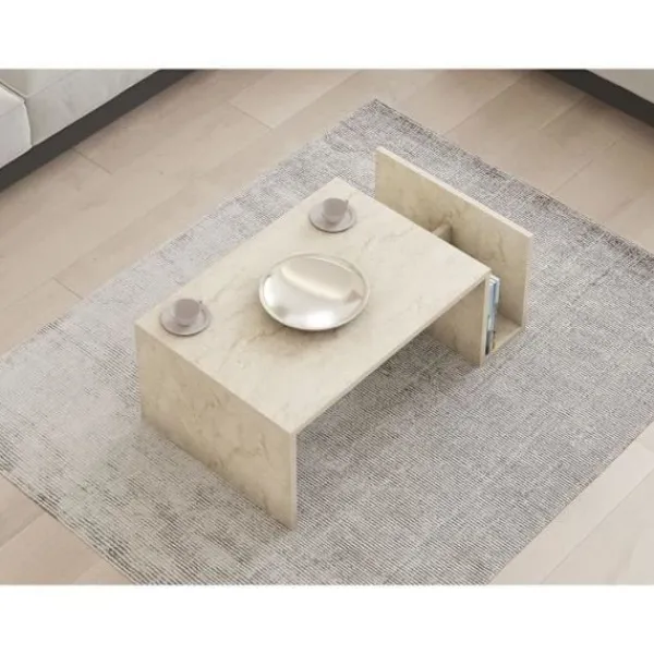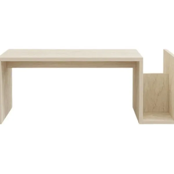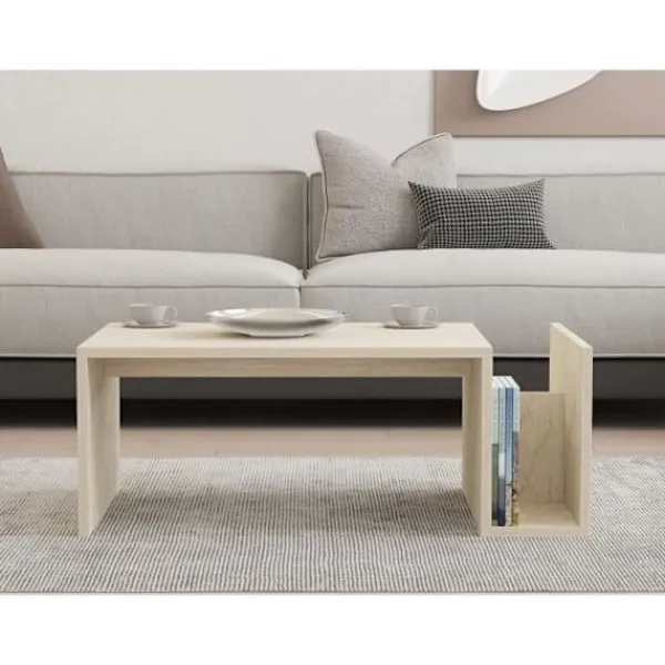 Förvandla ditt vardagsrum med vårt fantastiska soffbord i travertin. Denna eleganta möbel är inte bara ett bord, utan en stil- och sofistikationsuttalande. Den vackra travertinfärgen ger en touch av lyx till vilket rum som helst, vilket skapar en varm och välkomnande atmosfär som du och dina gäster kommer att älska. Höj din vardagsrum. Lägg till en touch av elegans i ditt vardagsrum med detta utsökta soffbord. Dess rena design och moderna finish gör det till den perfekta mittpunkten för vilket utrymme som helst. Oavsett om du dricker en kopp kaffe med vänner eller har en middag, kommer detta bord att imponera på alla som ser det. Kvalitetstillverkning. Tillverkat av 100% melaminbelagda spånskivor, är detta soffbord inte bara stiligt, utan också hållbart. En tjocklek på 18 mm säkerställer stabilitet och styrka, medan den nedre hyllan erbjuder extra lagringsutrymme för dina böcker, tidningar eller dekorativa föremål. Mångsidigt och funktionellt. Detta soffbord är inte bara en vacker möbel, utan också en praktisk. Med mått på 86,8 cm i bredd, 32,4 cm i höjd och 50 cm i djup har det den perfekta storleken för vilket vardagsrum som helst. Den nedre hyllan, som är 15 cm bred, ger extra lagringsutrymme utan att kompromissa med stilen.