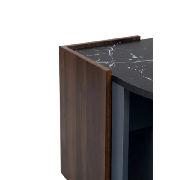 Fördjupa dig i en värld av elegans med vårt svarta marmorsoffbord och valnötsmassage. Detta mästerverk av möbelkonst kombinerar den tidlösa skönheten hos svart marmor med värmen från valnötsträ för att skapa en verkligt slående pjäs för ditt hem. De mörka marmorerna matchar den mörkgrå interiören och detta bord utstrålar en unik atmosfär. Dess tydliga linjer och smarta samspel mellan färger och material ger varje rum en speciell touch.
