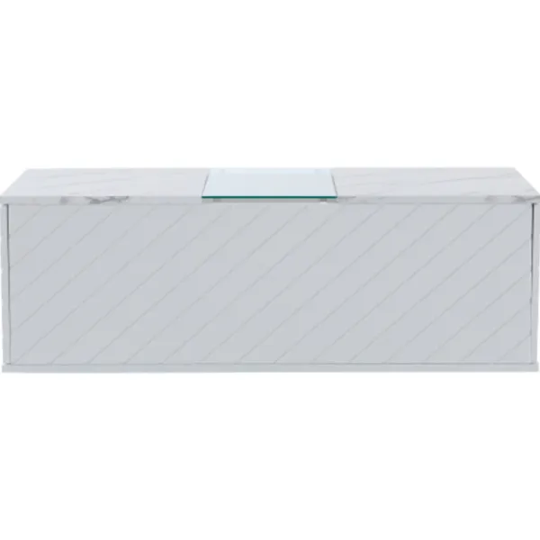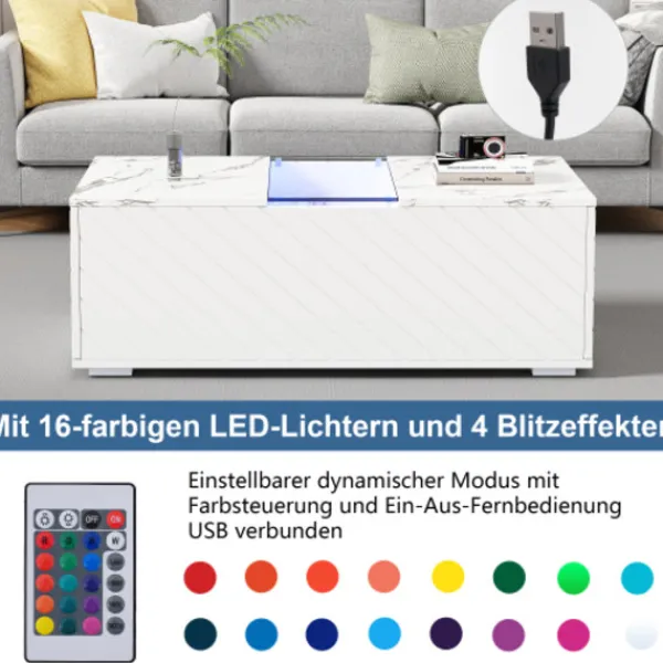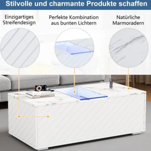 Ge ditt vardagsrum en touch av elegans med detta moderna vita soffbord. Med måtten 100x50x35 cm erbjuder bordet den perfekta storleken för att vara funktionellt och stilfullt på samma gång. Bordsskivan i ädel marmoroptik ger ditt rum en lyxig karaktär, medan glaselementet i mitten visuellt luckrar upp bordet och ger plats för dekoration. Den integrerade LED-belysningen skapar en stämningsfull atmosfär och sätter din inredning i rörelse.