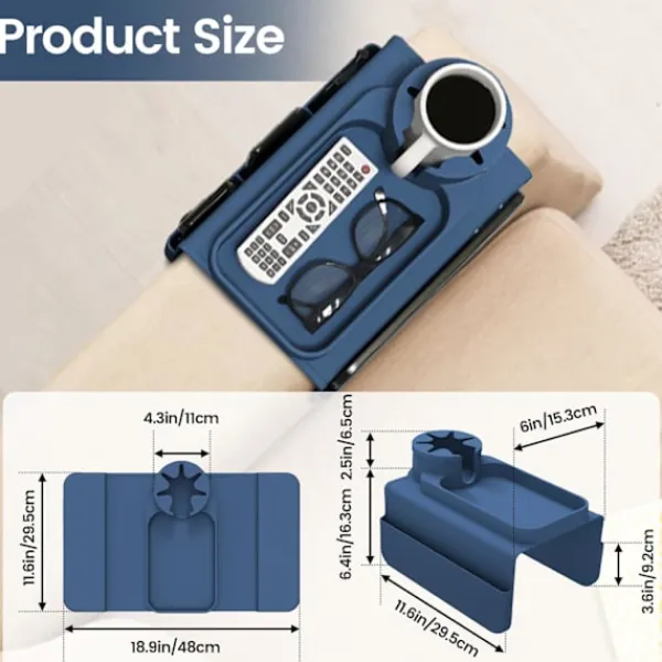 Uppgraderad Större Storlek: Denna sofforganisatör har en uppgraderad storleksdesign som passar bekvämt soffor med armstöd som sträcker sig från 15 till 35 cm breda. Den bredare brickan erbjuder mugghållare för att rymma koppar av olika storlekar, inklusive kaffemuggar.