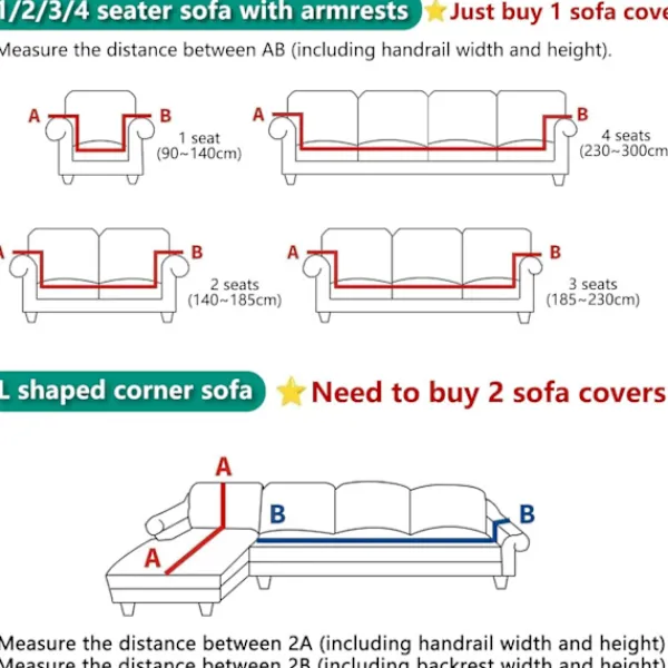 Storleksanvisning: mät din soffas längd (inkluderar höjd och bredd på armstöd) innan du bestämmer dig. Vi erbjuder 4 storlekar på sofföverdrag: 1-sits (90-140 cm), 2-sits (140-185 cm), 3-sits (185-230 cm), 4-sits (230-300 cm). Paketet innehåller endast ett sofföverdrag. Om du vill köpa ett L-format hörnsofföverdrag måste du köpa två set. !