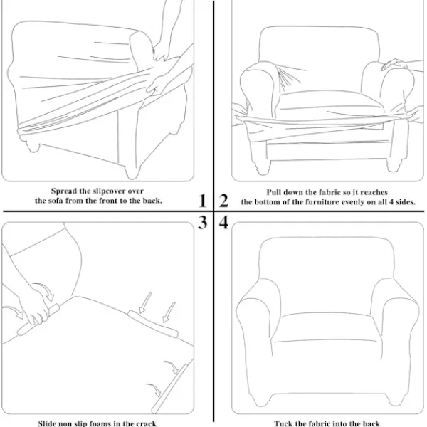 Snabb och enkel installation: (Se installationsguiden för mer information) Trä jacquardöverdraget över din soffa. Dra ner tyget så att det är elastiskt under alla fyra sidor. Stoppa in det extra tyget i kuddarna och skjut sedan in de halkfria skummen i spåren mellan ryggstödet och kuddarna. Jämna ut vecken (den elastiska botten täcker kanterna väl och sitter ordentligt på plats.)