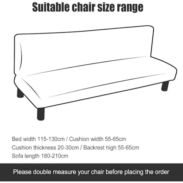 Lämplig för armstödslös soffa Soflängd 180-220cm, kuddbredd: 55-65cm, sängbredd: 115-130cm, rygghöjd: 55-65cm.Obs: Detta sofföverdrag är endast lämpligt för nämnda bäddsoffa utan armstöd.