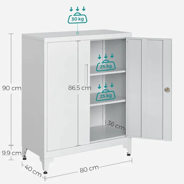 Skåpet är tillverkat av pulverlackerat stål som är både hållbart och rostbeständigt, vilket garanterar lång livslängd. Ytan är vattenavvisande och lätt att rengöra. För extra säkerhet medföljer tippskydd för väggmontering. Skåpet kan användas med eller utan de medföljande benen – de justerbara fötterna ger stabilitet även på ojämna golv.