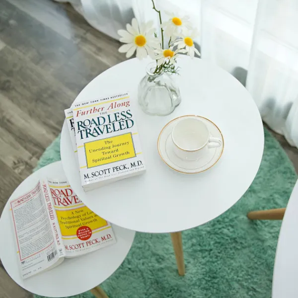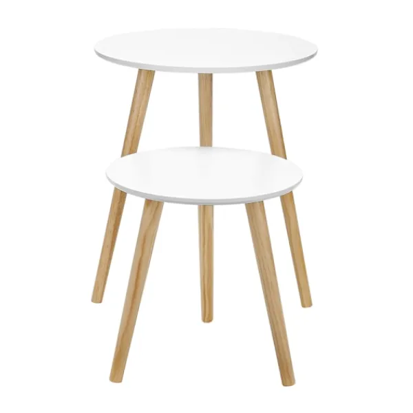 Detta satsbord i två delar kombinerar modern skandinavisk design med praktisk funktionalitet. De runda bordsskivorna i vitt kompletteras av stilrena ben i massivt furu, vilket skapar en naturlig och harmonisk känsla i hemmet. Tack vare den minimalistiska utformningen passar borden lika bra i vardagsrummet som på balkongen, vid sängen eller som växtpallar.