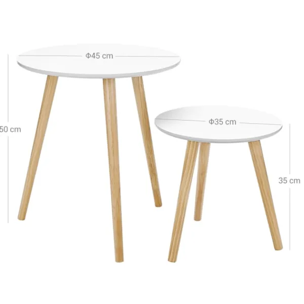 Det större bordet har en diameter på 45 cm och en höjd på 50 cm, medan det mindre bordet mäter 35 cm i diameter och är 35 cm högt. Den kompakta designen gör att de kan användas tillsammans eller var för sig, beroende på behov.