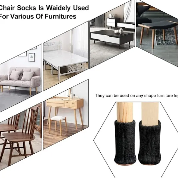 Produktfunktion Skydda golv, golvplattor, halkfria, bullerreducering. Möbelbenstrumpor är lätta att installera, de kan fästas ordentligt på möbelbenet och de kommer inte att falla av lätt. Stolsbenstrumporna är lämpliga för maskin- eller handtvätt, hållbara och återanvändbara.