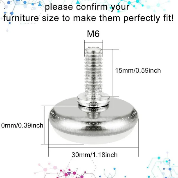 [Justerbar design] – Möbeljackfötterna har en tjock plastbas och höjdjusterbara skruvar. De justerbara bordsbenen kan justera höjden efter behov. Höjden på varje ben kan justeras med 2 cm så att möblerna kan placeras stadigt på ojämna golv. [Enkel att installera] – Det går snabbt och enkelt att installera denna justerbara jackfot. Den har en M6-skruv och en rund vit plastbas. Du kan kombinera den med möbler med gängade hylsor. Du behöver bara skruva fast dem på de 4 möbelbenen. [Brett användningsområde] – Nivelleringsfötterna passar för kontor eller hem, för lätta möbler med gängade ringar, för bord, skåp, stolar, skrivbord och andra möbler. De håller också dina möbler borta från fuktiga golv och håller möblerna rena och vackra. [30 st justerbara fötter] – Setet innehåller 30 st justerbara möbelfötter, gängstångens storlek är M6 x 15 mm, plastbasens diameter är 30 mm, totalhöjden är 25 mm. Totalt 30 möbelben räcker för dagliga behov.