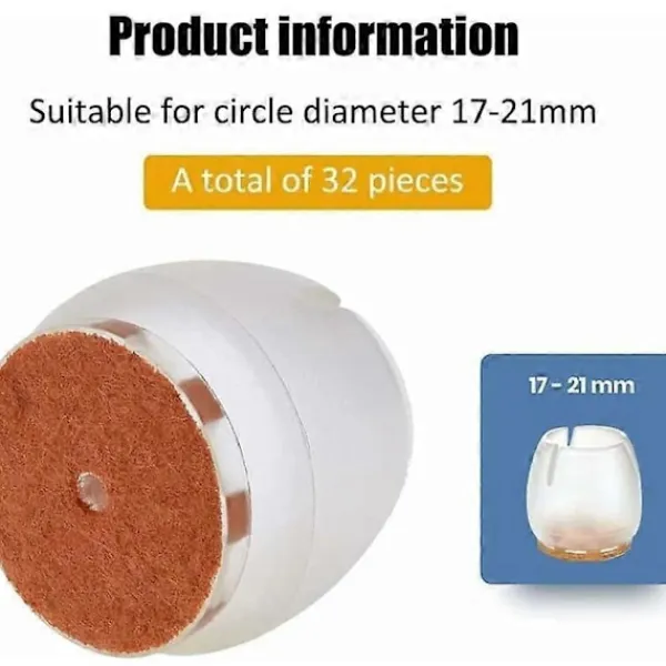 【Hög kvalitet】 Möbelskyddet för golv är tillverkat av slitstarkt silikon och fiberduk, halkfritt och faller inte lätt av, är hållbart och repar inte golvet. Stolsbensskydden kommer i ett paket om 32, de rundade stolsbenen är diskreta och kommer inte att försämra möbelns skönhet. Kontrollera storleken innan du köper. Stolsdynorna passar stolsben med en diameter på 17-21 mm och anpassar sig till olika benstorlekar. Upplev inga skarpa ljud när du flyttar stolar eller bord. Du behöver aldrig kämpa med självhäftande dynor som faller av eller lim som fastnar på golvet. Stolsdynan låter dig skydda alla typer av golv: trä, laminat, kakel, linoleum… Silikonstolsbensskydden är tillräckligt stretchiga för att passa de flesta runda stolsben. Lätt att installera och relativt robusta, skjut dem helt enkelt över stolsbenen så dras de in nästan av sig själva.