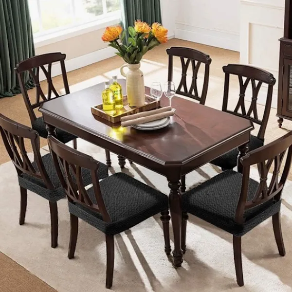 Stolsöverdragen är gjorda av 95 % polyester och 5 % spandex. Mjukt, bekvämt och skrynkelfritt material som inte behöver strykas. Modernt jacquardtyg hjälper dig att skydda dina möbler från dagliga revor, spill, fläckar etc.