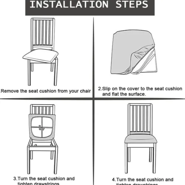Uppgraderad design: Lätt att installera, köksstolsöverdragen är designade med en hög elastisk knytning kombinerat med en knapp. Stolsöverdragets tyg med vattentät och dammtät prestanda kan skydda stolen från spilld kaffe och vatten, matrester och smuts. Fräscha upp och gör din stol långvarig i vardagen, det är idealiskt för hem med husdjur eller barn, eller för alla som letar efter en ekonomisk lösning för möbelskydd.