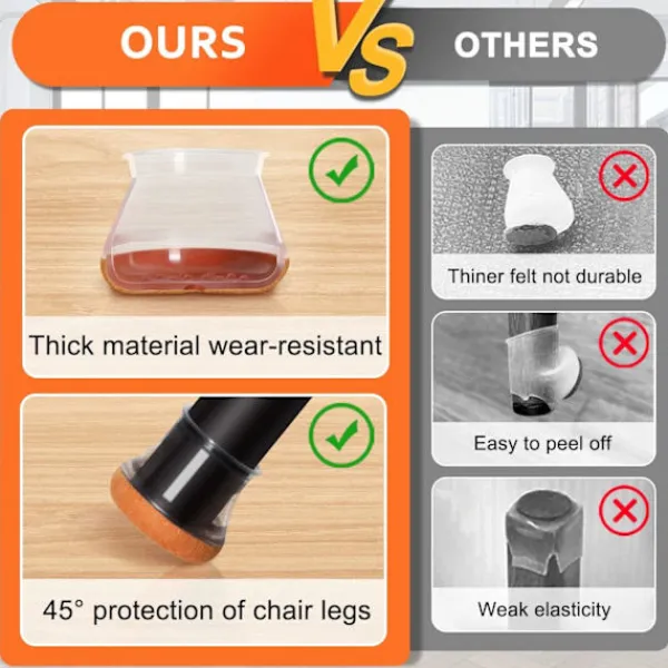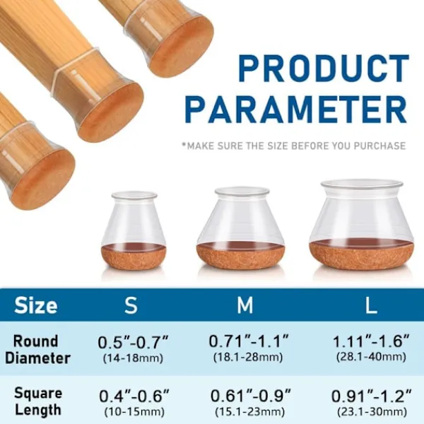 [Förstärkt bottenfiltdyna] – Den nya versionen av skyddet har en koppformad filtdyna, som ger bättre skydd för golvet och själva skyddet jämfört med en tunn platt dyna. Den förstärkta bottenkonstruktionen gör den säkrare att passa stolsbenen, vilket förhindrar glidning och rörelse. Dessutom kan du luta stolen i valfri vinkel utan att oroa dig för att skada golvet och själva skyddet. Den har en längre livslängd och kan skydda golvet bättre. [Används i stor utsträckning i flera scenarier] – Du behöver inte oroa dig för formen på möbelbenet, eftersom det har god formbarhet. Lämplig för olika möbelben: köksstolar, terrassstolar, matstolar, barstolar, byråer, uteplatser, brädor, skrivbord etc. Silikonmaterial är smuts- och vattenavvisande. [Sträckbar passform för en rad storlekar] – Möbelbensskydd för golv är smala upptill och breda nedtill för att passa olika storlekar. Passar runda ben med diameter 0,81″ till 1,2″ (18,1-28 mm); Passar fyrkantiga ben med diameter 0,71″ till 1,1″ (15,1-23 mm). [Enkel installation] – Dessa skydd är lätta att installera och kan monteras på dina stolsben på bara några sekunder. Trä bara på skydden över benen så sitter de säkert på plats, vilket ger bättre skydd för dina golv och minskar buller. [Hållbart material] – Våra skydd kan återanvändas, och rengör dem helt enkelt med vatten för att göra dem som nya. Filtkudden i botten är mycket slitstark och kommer inte att skadas av långvarig användning, vilket effektivt kan skydda golvet från repor, nötning och andra skador orsakade av stolsben.
