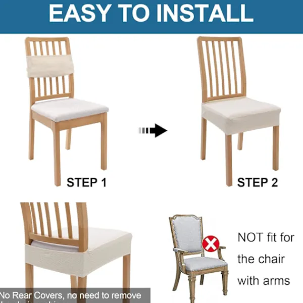 Enkel att installera: Detta matstolsöverdrag med bakre gapped design, inget behov av att ta bort stolsdynorna, bara dra på, elastiska kanter kommer att säkra stolsöverdraget på plats ordentligt, snabbare installation och spara tid. Passar INTE för stolen med armstöd.