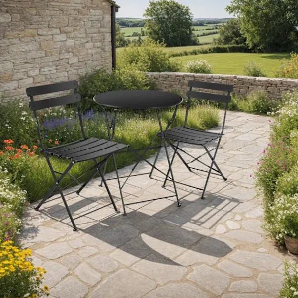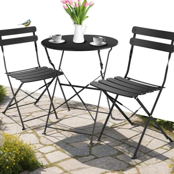 Upptäck bistrobord set Frieda från tectake – den perfekta lösningen för mysiga stunder utomhus. Setet består av 1 runt bistrobord och 2 stolar med ribbdesign, perfekta för små balkonger och trädgårdar.