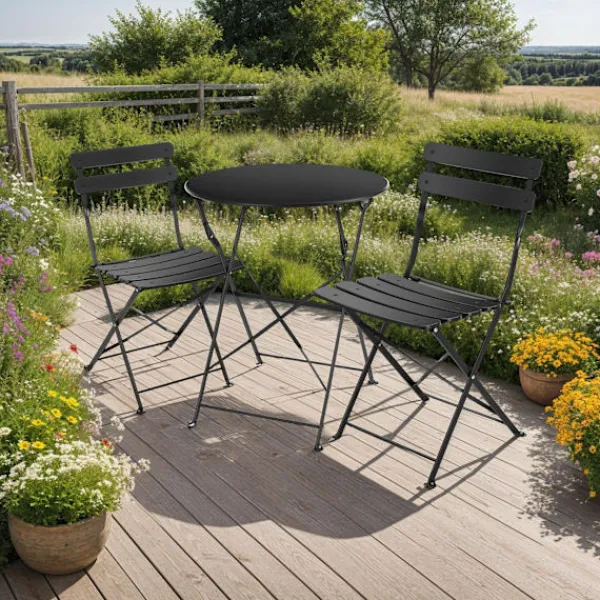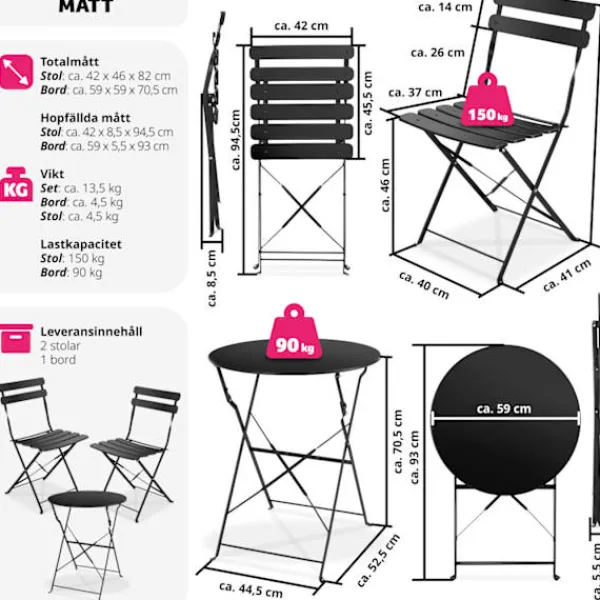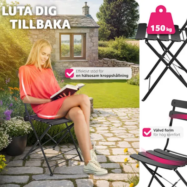 Med sin hopfällningsfunktion kan du enkelt förvara eller transportera möblerna. Ingen montering behövs, och de solida, pulverlackerade stålramarna ger både hållbarhet och stabilitet. De halkfria fotkåporna skyddar golvet.
