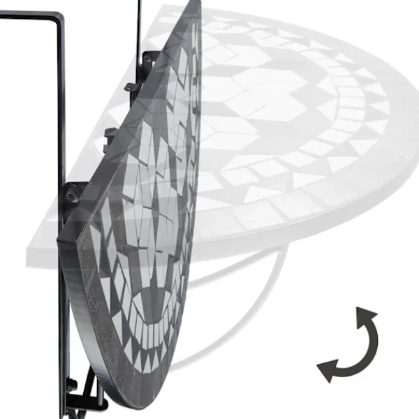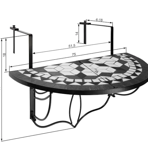 På detta balkongbord från tectake har du alltid vad du behöver för en lyckad sommardag inom räckhåll. Den stabila konstruktionen med två metallkrokar kan enkelt hängas upp på ett balkongräcke. Den halvcirkelformade bordsskivan med mosaikmönster utstrålar en medelhavskänsla och erbjuder gott om utrymme. Efter användning kan hängbordet fällas ner för att ta mindre plats. En oumbärlig accessoar för en semester på balkongen: Ditt nya praktiska balkongbord från tectake.