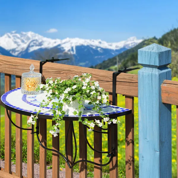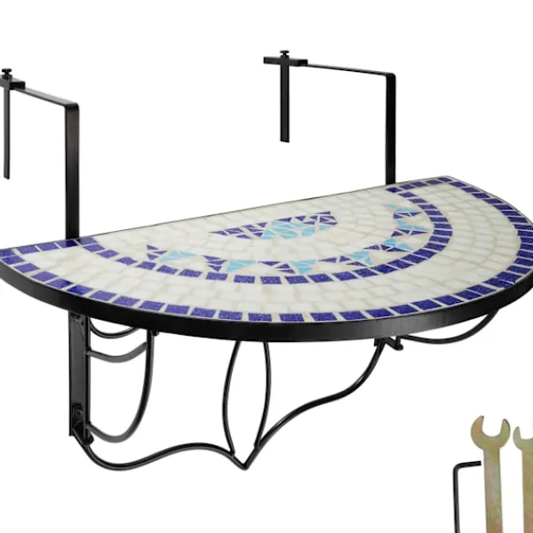 På detta balkongbord från tectake har du alltid vad du behöver för en lyckad sommardag inom räckhåll. Den stabila konstruktionen med två metallkrokar kan enkelt hängas upp på ett balkongräcke. Den halvcirkelformade bordsskivan med mosaikmönster utstrålar en medelhavskänsla och erbjuder gott om utrymme. Efter användning kan hängbordet fällas ner för att ta mindre plats. En oumbärlig accessoar för en semester på balkongen: Ditt nya praktiska balkongbord från tectake.