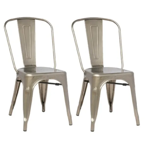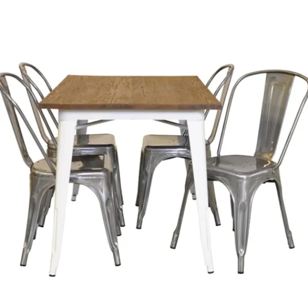 Detta franskinspirerade set består av bord med toppskiva i rustik, ruffig, mörkbrun alm. Till detta hör 4 plåt stolar.
